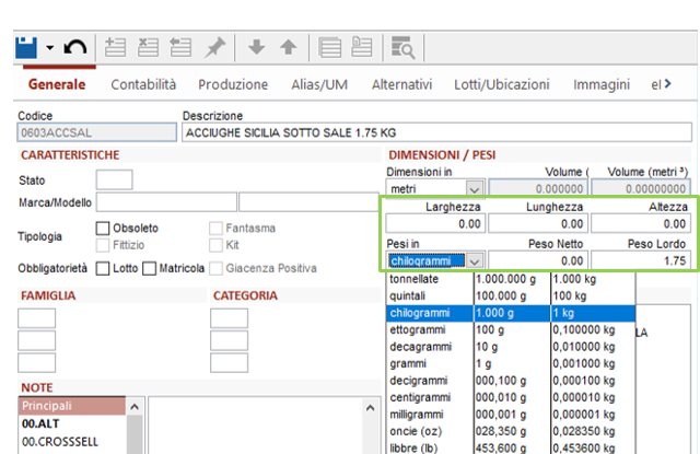 - All’interno dell’anagrafica dell’articolo occorre selezionare l’unità di misura e le varie dimensioni che possono essere: peso lordo, lunghezza, larghezza, altezza.