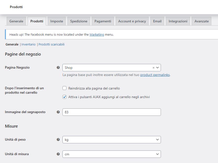 - All’interno di WooCommerce (Impostazioni, Prodotti) occorre definire l’unità di peso e l’unità di misura che andranno a coincidere con quelle utilizzata in Arca per tutti gli articoli.