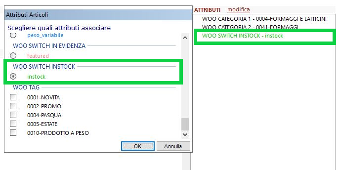 L’attributo “instock” vince sul criterio di controllo di disponibilità scelto (Es.: se è stato scelto il criterio “Se giacenza > 0” l’articolo che avrà l’attributo “instock” sarà comunque sempre disponibile online.)