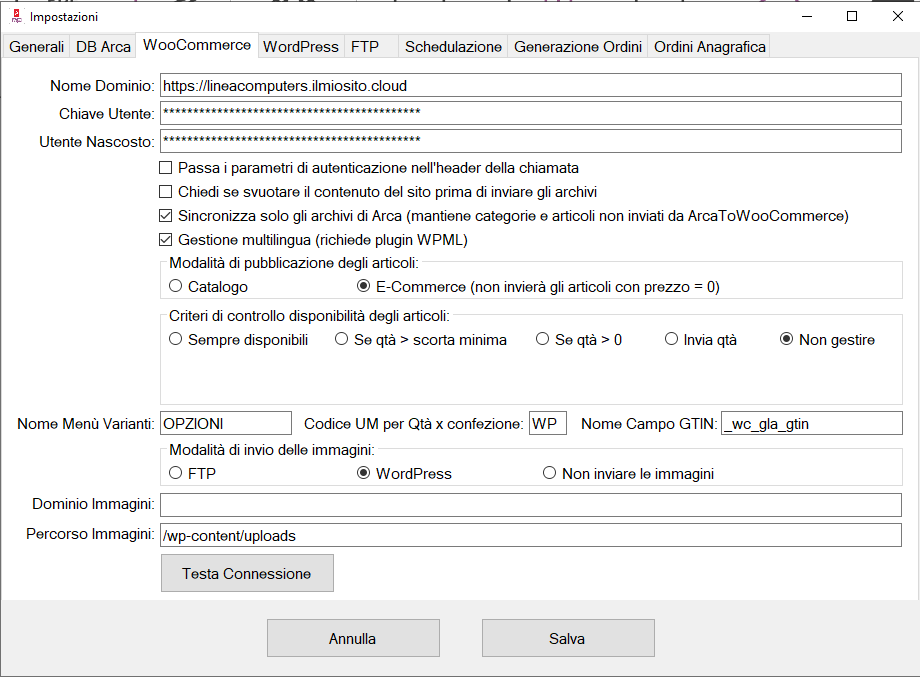 Se non si vuole mai inviare a WooCommerce la disponibilità di prodotto basta scegliere l’opzione “NON GESTIRE”.