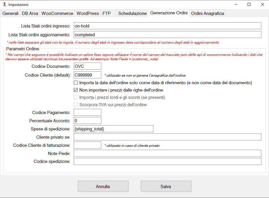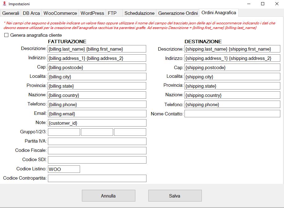 Indicando un valore fisso oppure una variabile tra parentesi graffe, è possibile riportare quei dati all’interno dell’anagrafica cliente di Arca nel momento della creazione (quando l’ordine da WooCommerce viene importato in Arca)
