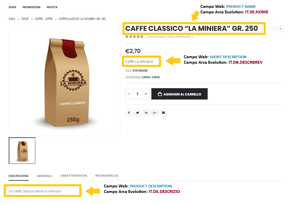 Ecco una visualizzazione lato Web della scheda articolo codificata all’interno di Arca Evolution attraverso le NOTE STANDARD descritte di seguito: