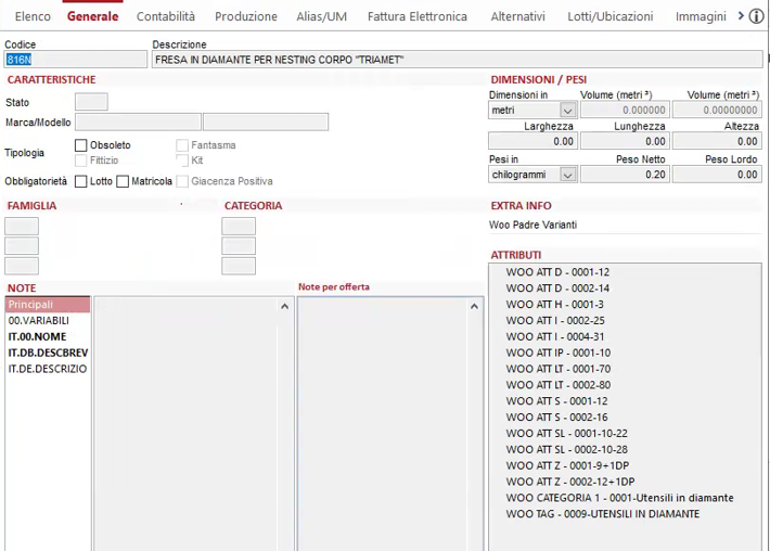 Deve essere creato un articolo Padre che non deve contenere varianti. Questo sarà l’articolo che verrà inviato a WooCommerce (codificato con categoria, descrizioni e tag).