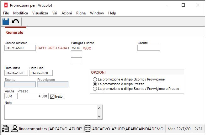 - Indicare lo sconto (solo numerico, senza %) e definire nelle opzioni la promozione di tipo Sconto/Provvigione