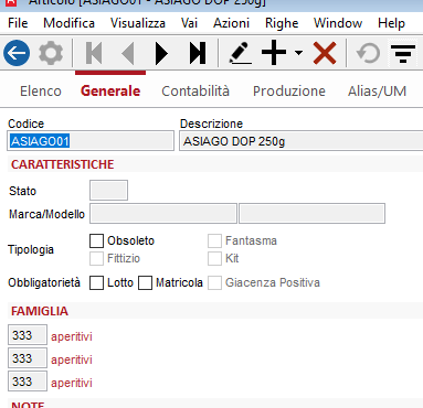 Inserire quindi all’interno dell’anagrafica degli articoli che faranno parte di una determinata famiglia, la famiglia creata.