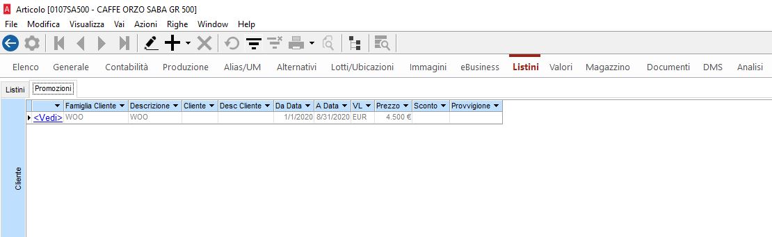 All’interno dell’articolo visualizzerai nella sezione LISTINI/PROMOZIONI la promozione associata all’articolo.