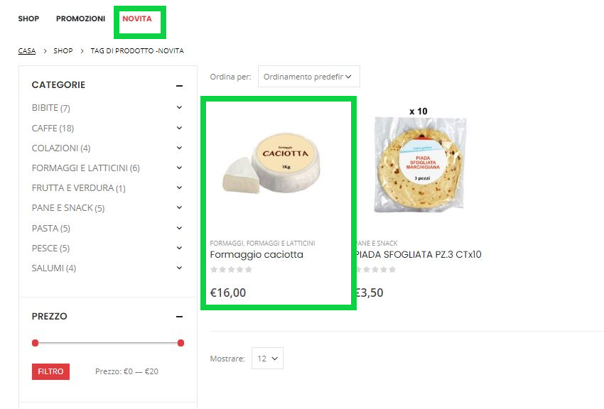 Lato Web utilizzando articoli con dei TAG (per esempio: 0001-NOVITÀ) avremo questa visualizzazione: